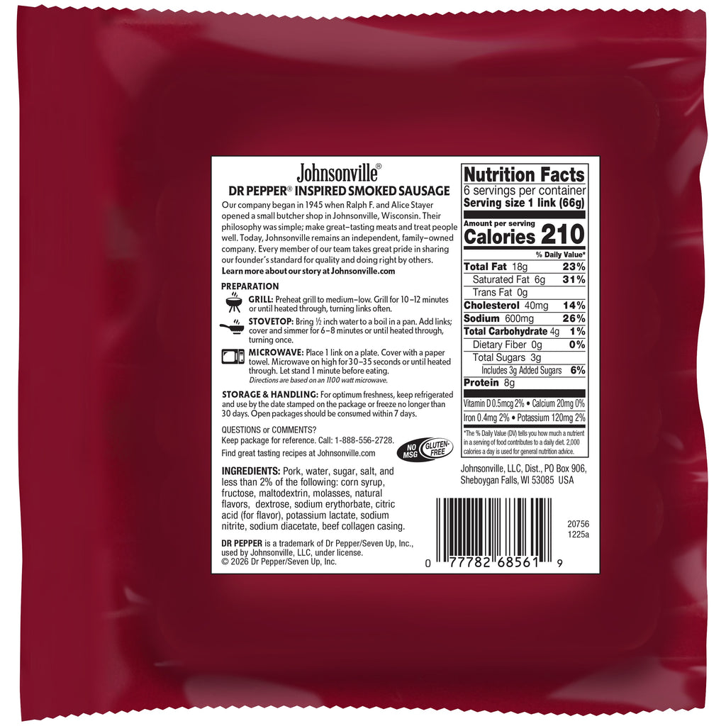 What happens when an iconic soda meets a legendary sausage maker? Johnsonville Dr Pepper® Inspired Sausage. Crafted from 100% premium cuts of pork and free from artificial colors and flavors, these links are the mouthwatering fusion of Dr Pepper’s signature 23 flavors with Johnsonville’s savory sausage. Versatile enough to headline a bun, star on kabobs, top nachos, or elevate burnt ends, they’re simple to prepare on the grill, stove, or air fryer. Curious if sausage that tastes like soda goes too far? There’s only one way to find out. Add to your cart and Keep It Juicy.